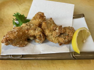 | ふぐから揚げ 1人前 770 円 (税込) ふぐの身(骨つき)をしょうがの効いた タレにつけ、サッと揚げてあります。 レモンをしぼってお召し上がりください。 (写真は1人前) |